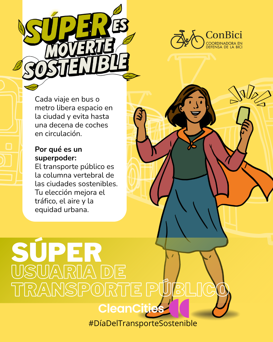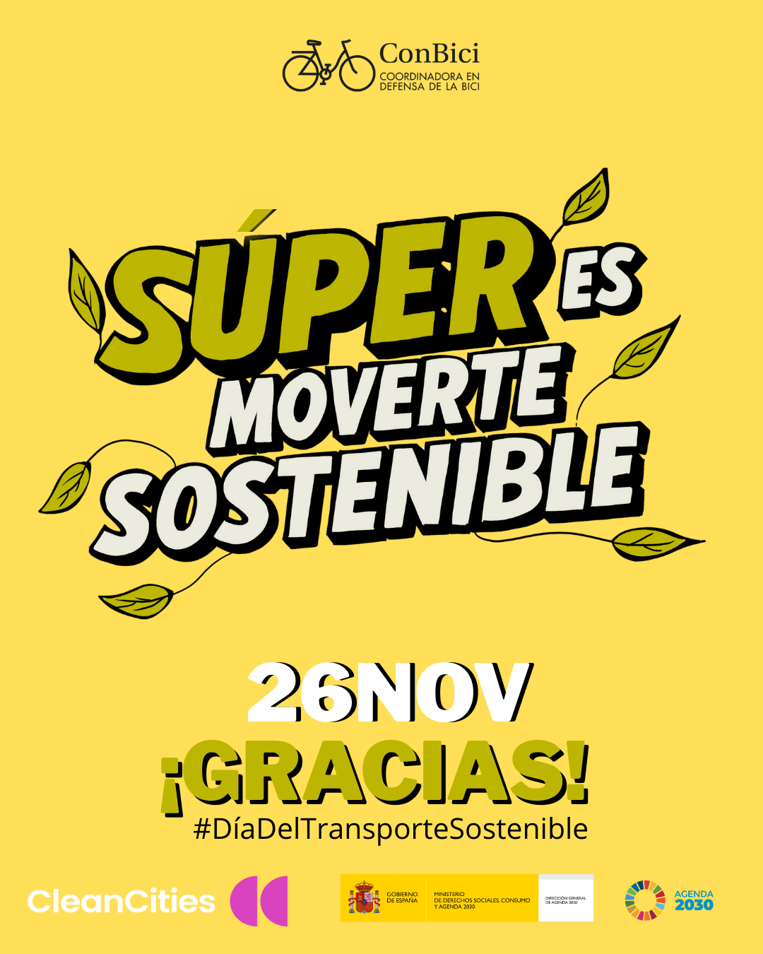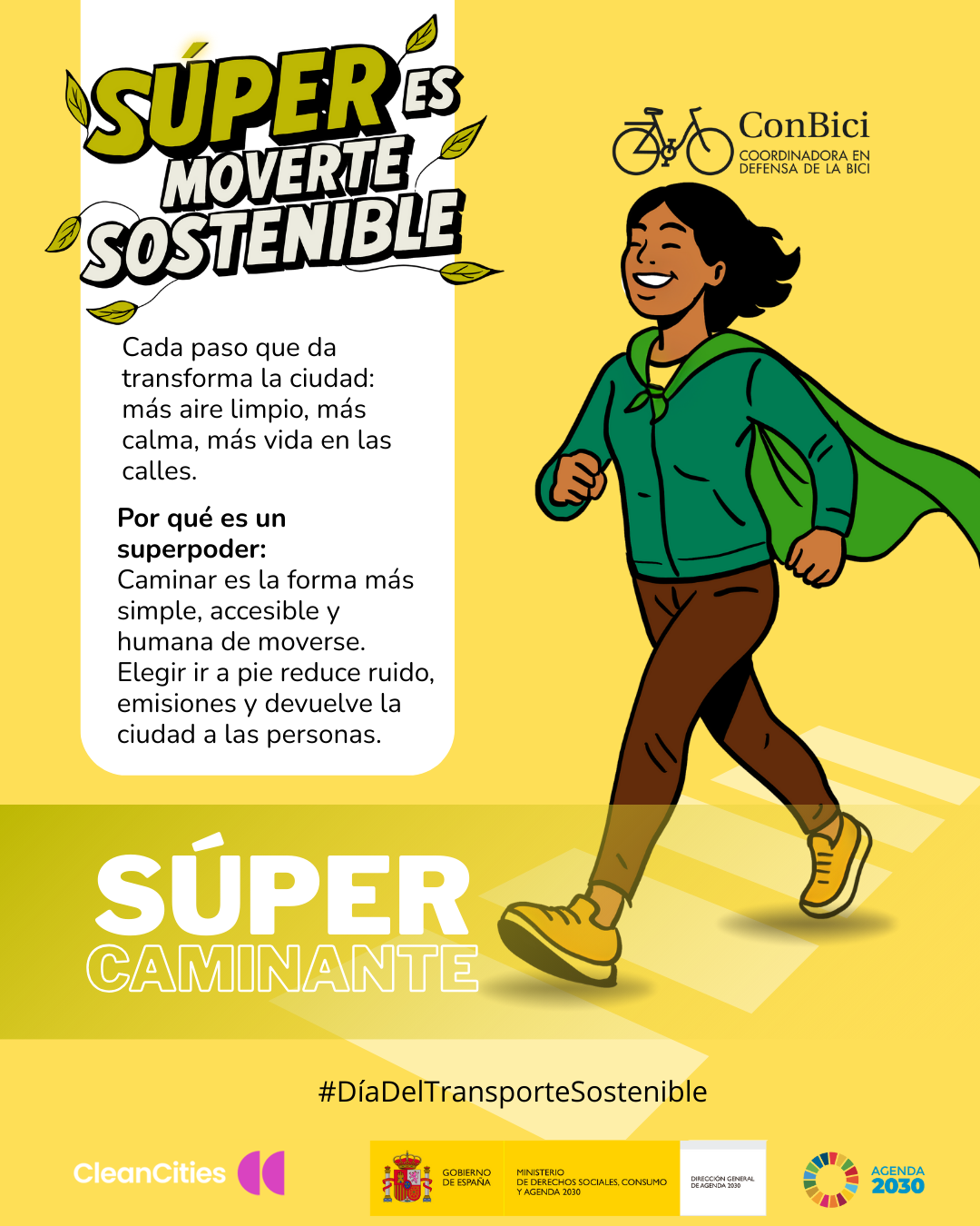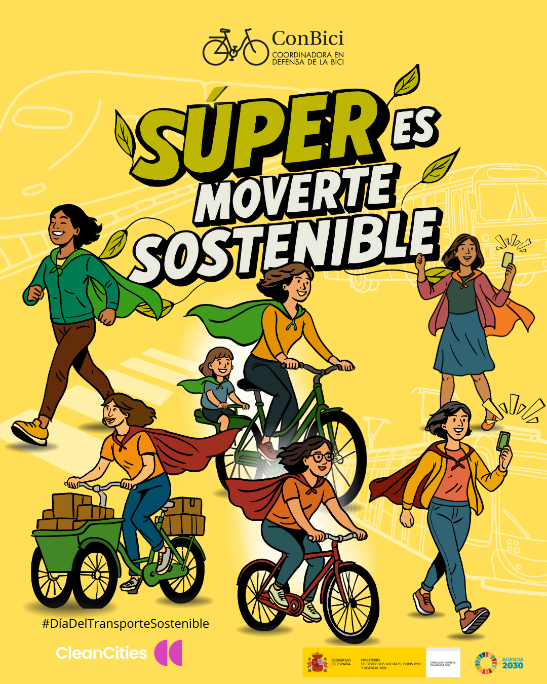 El pasado 26 de noviembre, se celebró el Día Mundial del Transporte Sostenible, una fecha proclamada por Naciones Unidas para reforzar la importancia de impulsar sistemas de movilidad seguros, accesibles, eficientes y con bajas emisiones. En el marco de esta jornada, ConBici, organización miembro de la Red Clean Cities Europa, presentó la campaña SÚPER es moverte sostenible, un homenaje a todas las personas que cada día caminan, pedalean o utilizan el transporte público, contribuyendo de manera directa a reducir emisiones y mejorar la salud urbana.